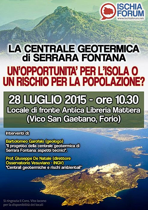 Lo staff di Ischia Forum ha seguito fin dall’inizio l’evoluzione delle procedure che hanno portato alla richiesta di VIA (Valutazione di Impatto Ambientale) per il progetto di costruzione di una centrale geotermica sull’isola d’Ischia, nel comune di Serrara Fontana, scaturita dall’emanazione del Decreto Legislativo n. 28 del 3 marzo 2011 in attuazione della Direttiva 2009/28/CE del Parlamento Europeo. Si è studiata attentamente tutta la documentazione depositata dalla società IschiaGeoTermia Srl, discusso con professionisti e ricercatori che si occupano di geotermia e delle tecnologie per lo sfruttamento della risorsa, analizzato impianti analoghi nel mondo. Contemporaneamente si è constatato che sull’argomento geotermia e fonti energetiche rinnovabili esiste ancora una gran confusione a cui non giova il fatto di mettere in evidenza esclusivamente i rischi ambientali connessi ad un impianto di ultima generazione, ove mai questi esistessero. Sulla scorta delle informazioni criticamente raccolte e discusse, si è deciso di promuovere un incontro pubblico per il prossimo martedì 28 luglio alle ore 10:30. L’incontro si terrà presso i locali di fronte l’Antica Libreria Mattera in vico San Gaetano a Forio, grazie all’ospitalità del Consigliere, presso il comune di Forio, Vito Iacono. Proveremo a fare il punto della situazione a partire da due brevi conferenze: la prima, a cura di Bartolomeo Garofalo, geologo, verterà sull’analisi tecnica del progetto relativo alla centrale geotermica di Serrara Fontana. La seconda, a cura di Giuseppe De Natale, direttore dell’Osservatorio Vesuviano, sarà invece improntata sul tema dei rischi ambientali indotti dall’attività di estrazione delle risorse geotermiche. Infine verrà dato lo spazio necessario alle eventuali domande sulla tematica discussa.